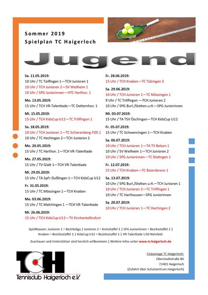 Da die Trillfinger eine Doppelbelegung auf ihrer Clubanlage haben, wird der Spielbeginn der Begegnung unserer Junioren 2 in Trillfingen von 10 Uhr auf 9 Uhr vorverlegt. Wir bitten um Beachtung!